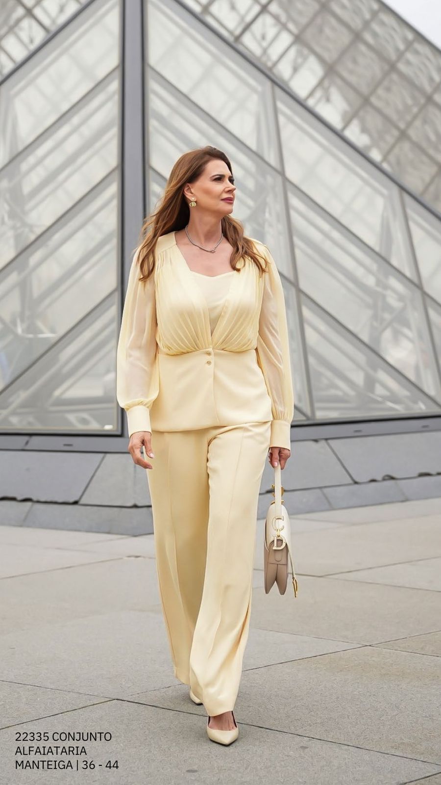 Elegante e atemporal, o conjunto em alfaiataria manteiga traduz sofisticação e presença em cada detalhe.