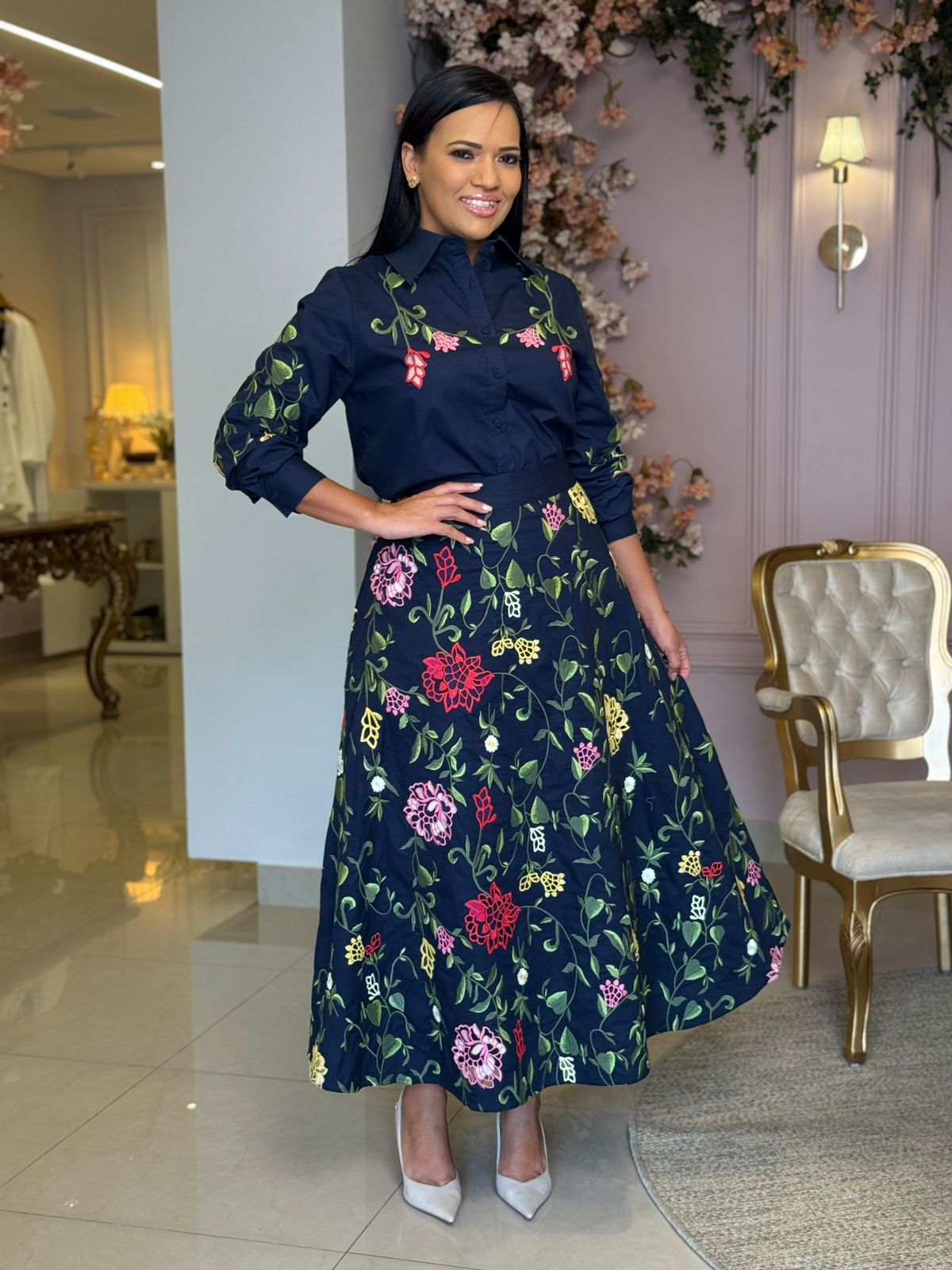 Composto por camisa estruturada e saia midi bordada, o modelo é marcado pelos detalhes florais vibrantes, que transformam o visual em uma verdadeira obra de arte.