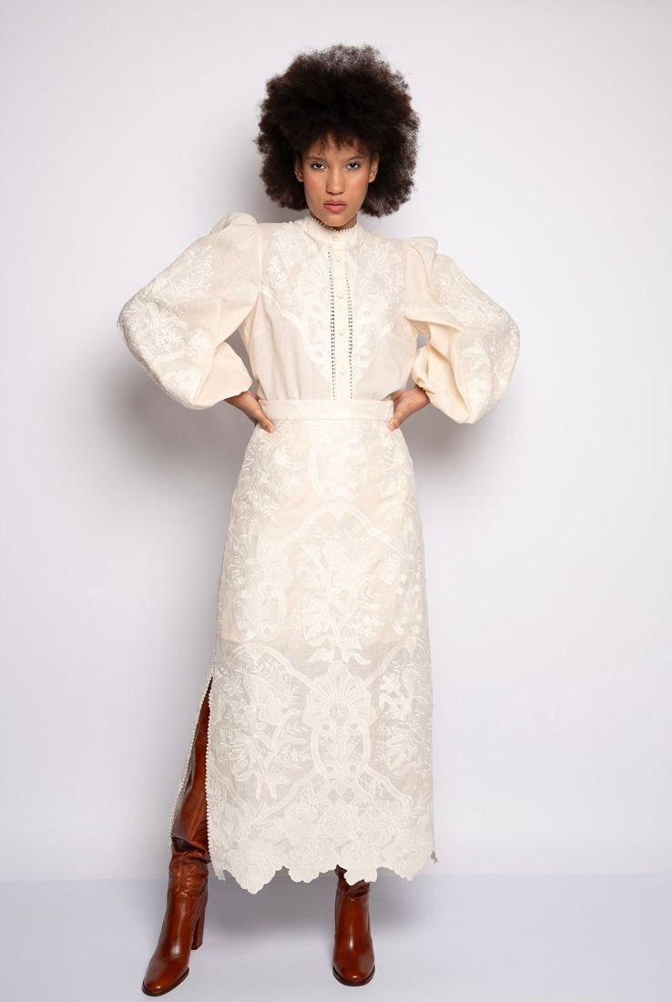 A blusa com mangas volumosas confere presença e personalidade, enquanto a saia midi com recortes e barrado bordado finaliza a produção com movimento e leveza.