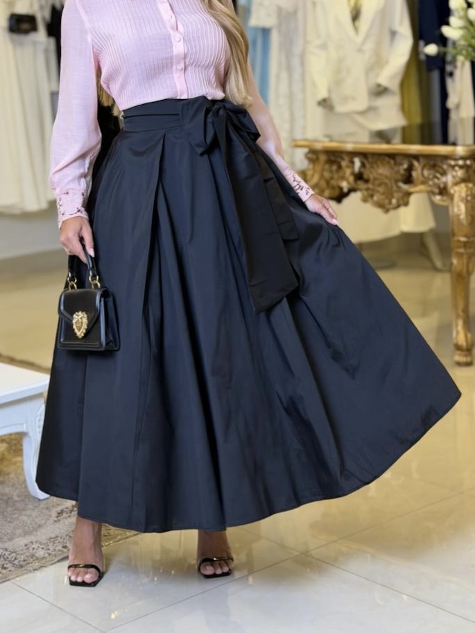 Confeccionada em tecido estruturado com leve brilho, a saia proporciona um caimento impecável, criando uma roda elegante e volumosa.