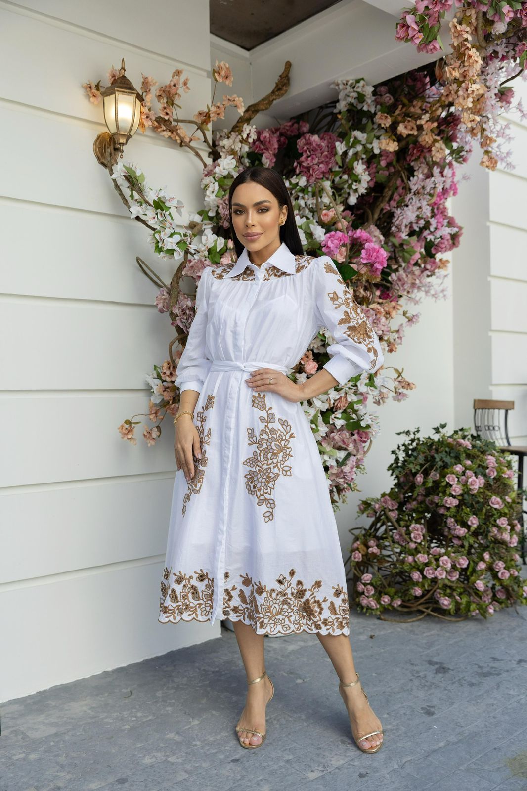O bordado floral em tom caramelo adiciona delicadeza artesanal ao look, criando contraste harmônico e sofisticado sobre o branco puro da peça.