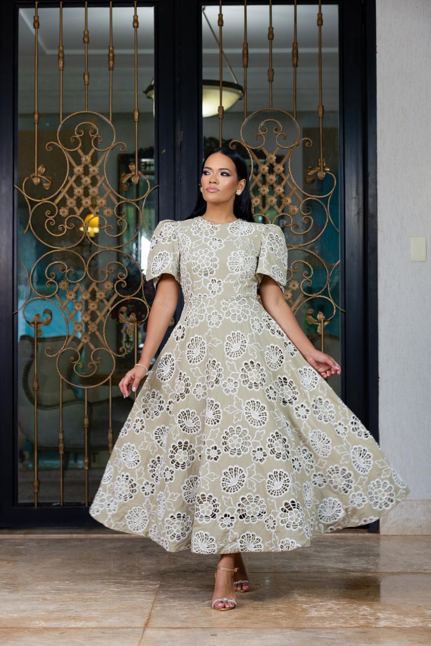 Vestido sofisticado confeccionado em tecido 100% algodão com aplicação de renda richilieu de alta qualidade. Possui mangas estruturadas e saia midi evasê com amplo movimento. A modelagem exclusiva valoriza a silhueta com elegância, garantindo conforto, leveza e um visual clássico e atemporal. Ideal para eventos formais, casamentos, cultos, formaturas e ocasiões especiais.