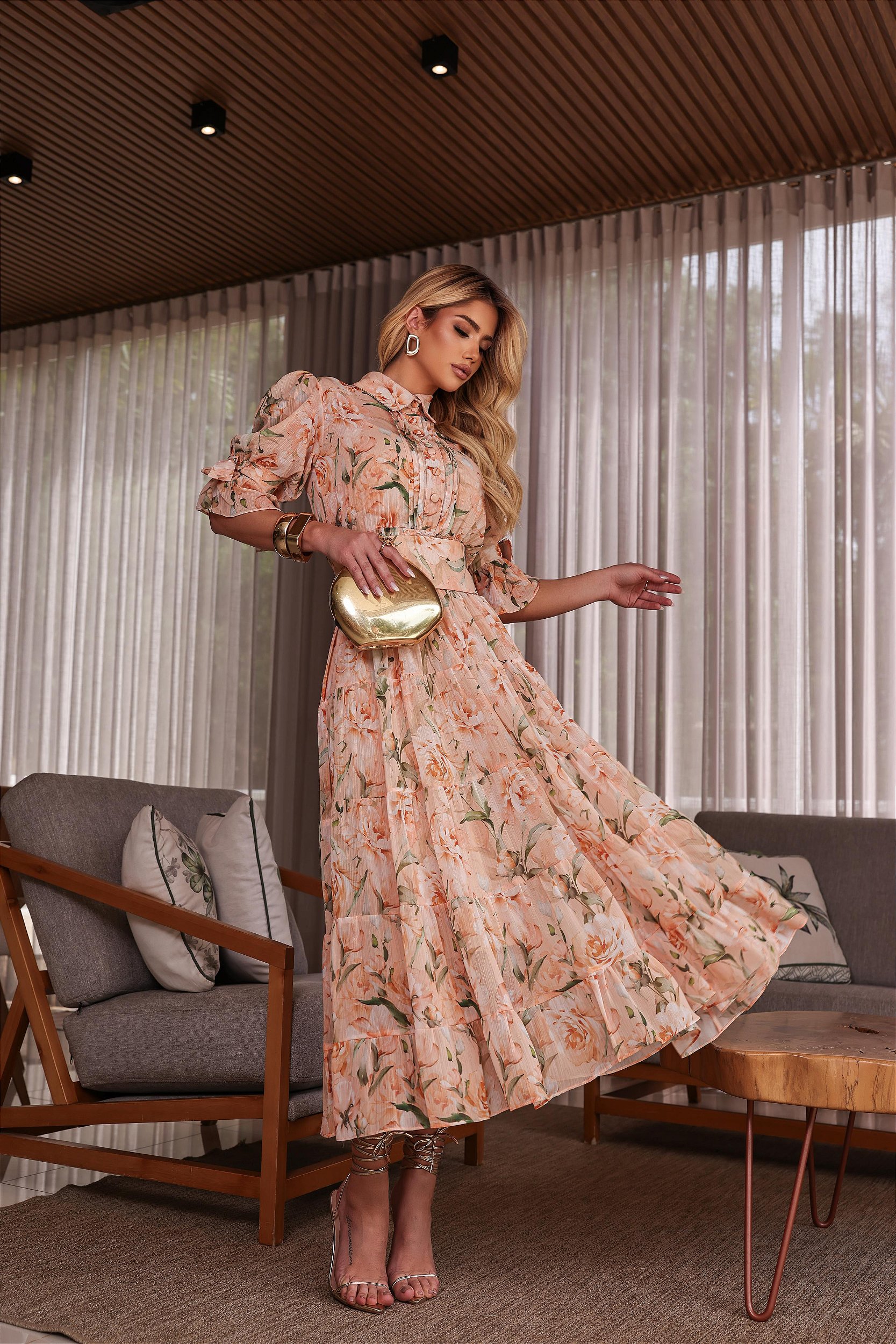 Romântico e atemporal, o vestido midi em chiffon floral traz movimento leve e um visual delicado e elegante.